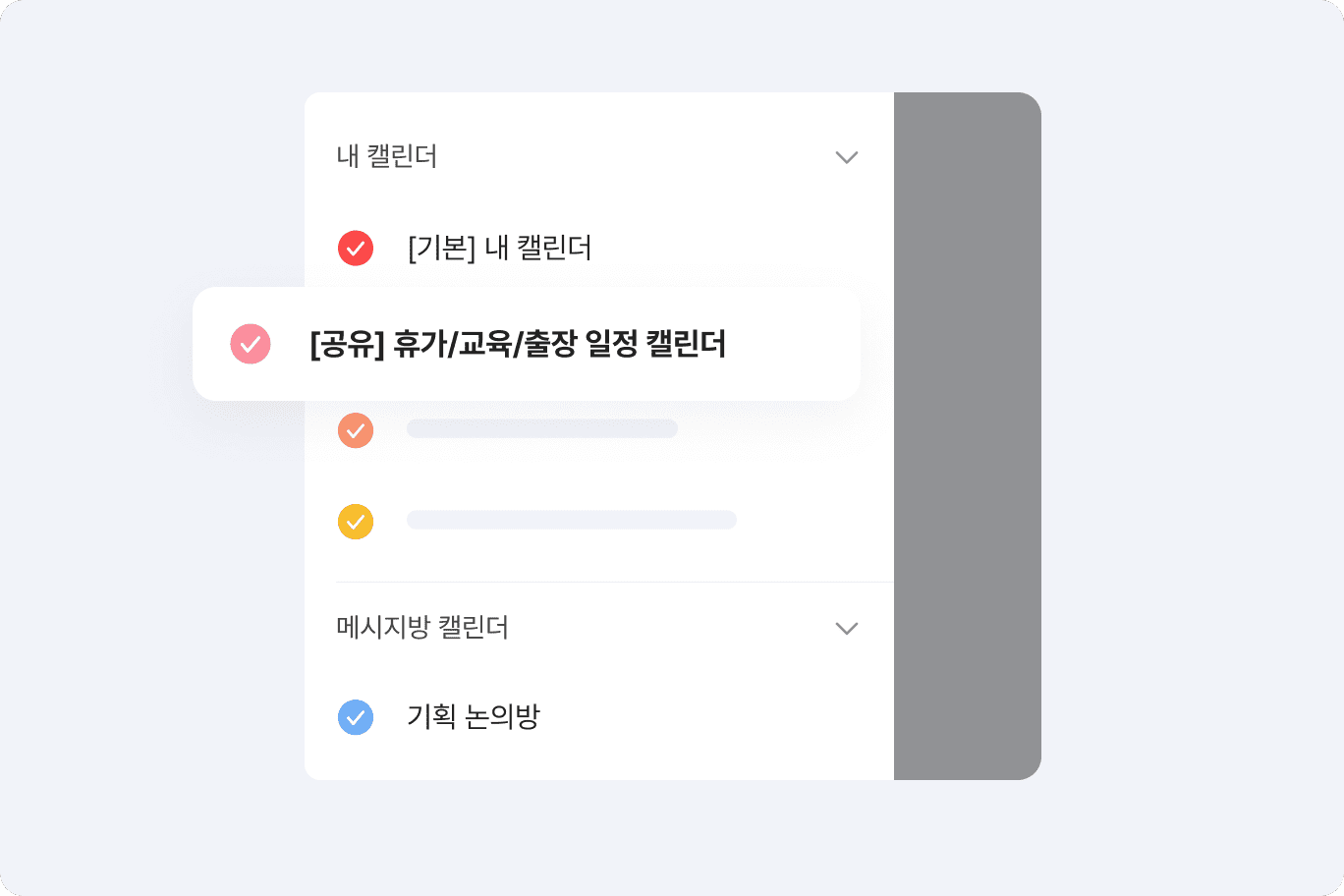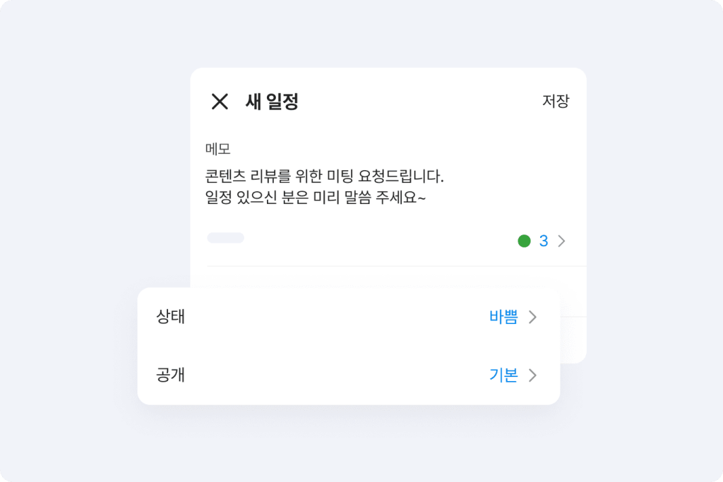 일정 등록 또는 초대 시 다른 구성원에게 공개 또는 비공개 여부를 설정할 수 있어 목적 또는 필요에 맞게 사용할 수 있습니다.
