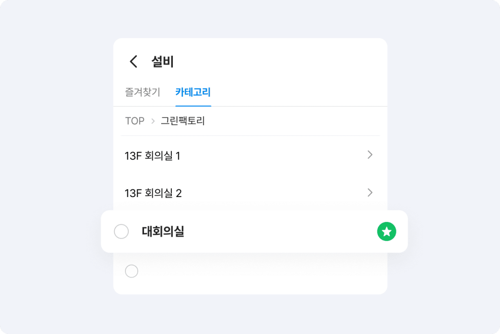 회사가 공용으로 사용하는 회의실, 화상회의 장비 등은 공용 설비에 등록하여 설비를 등록하고 관리할 수 있습니다. 등록된 설비는 일정을 생성하거나 설비 예약 시 사용할 수 있습니다.