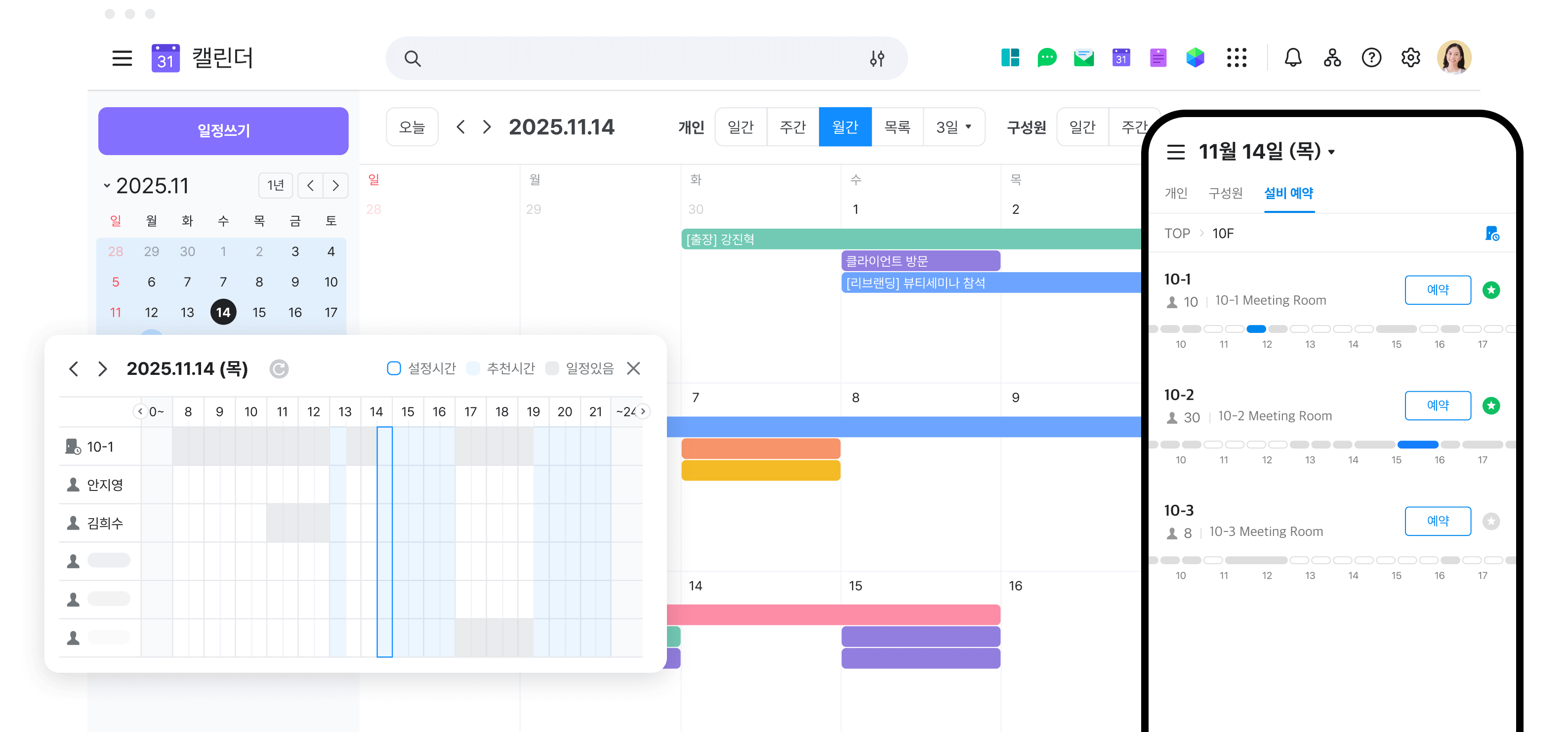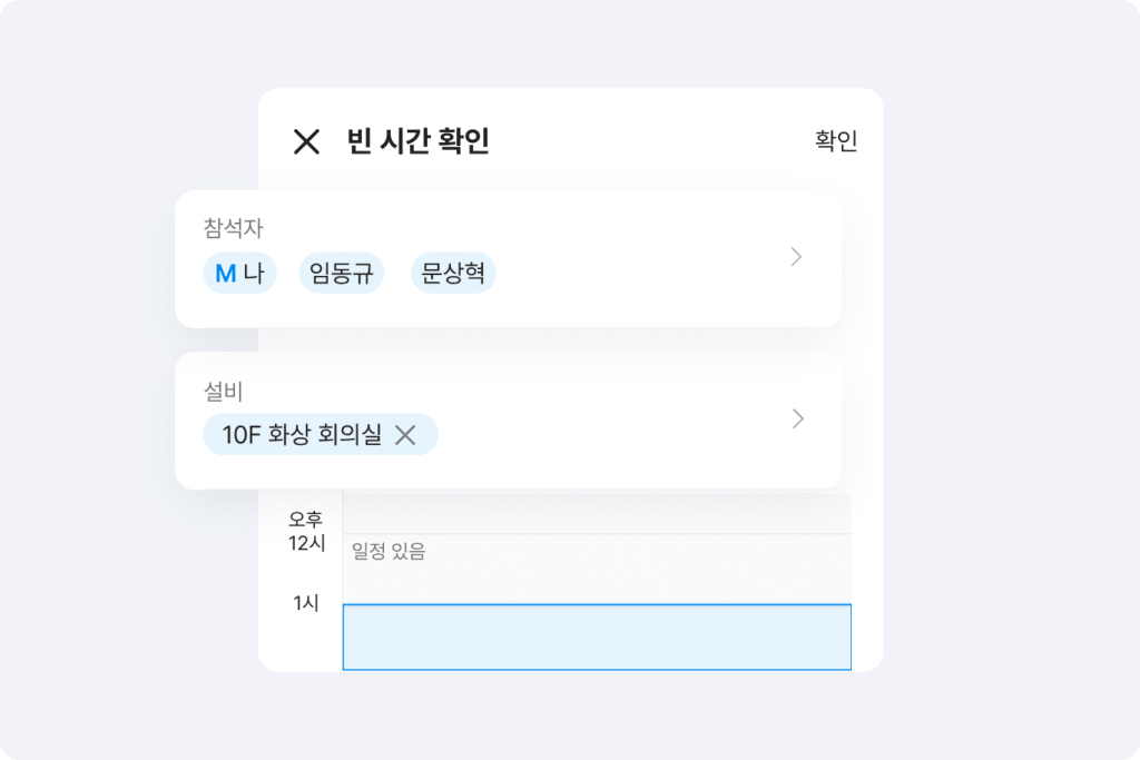 여러 명이 참석하는 일정에 빈 시간을 확인하면 그 시간에 예약 가능한 설비까지 자동으로 찾아주어 쉽게 일정을 잡을 수 있고, 설비가 없어 난처한 상황도 없어집니다.