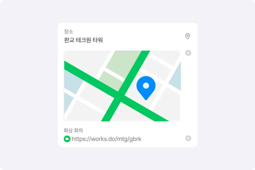 오프라인 공간에 모여 회의 또는 미팅 진행이 어려운 경우, 일정에 화상회의 링크를 첨부해 보세요. 공간의 제약 없이 언제나 선명하게 회의를 진행할 수 있습니다.