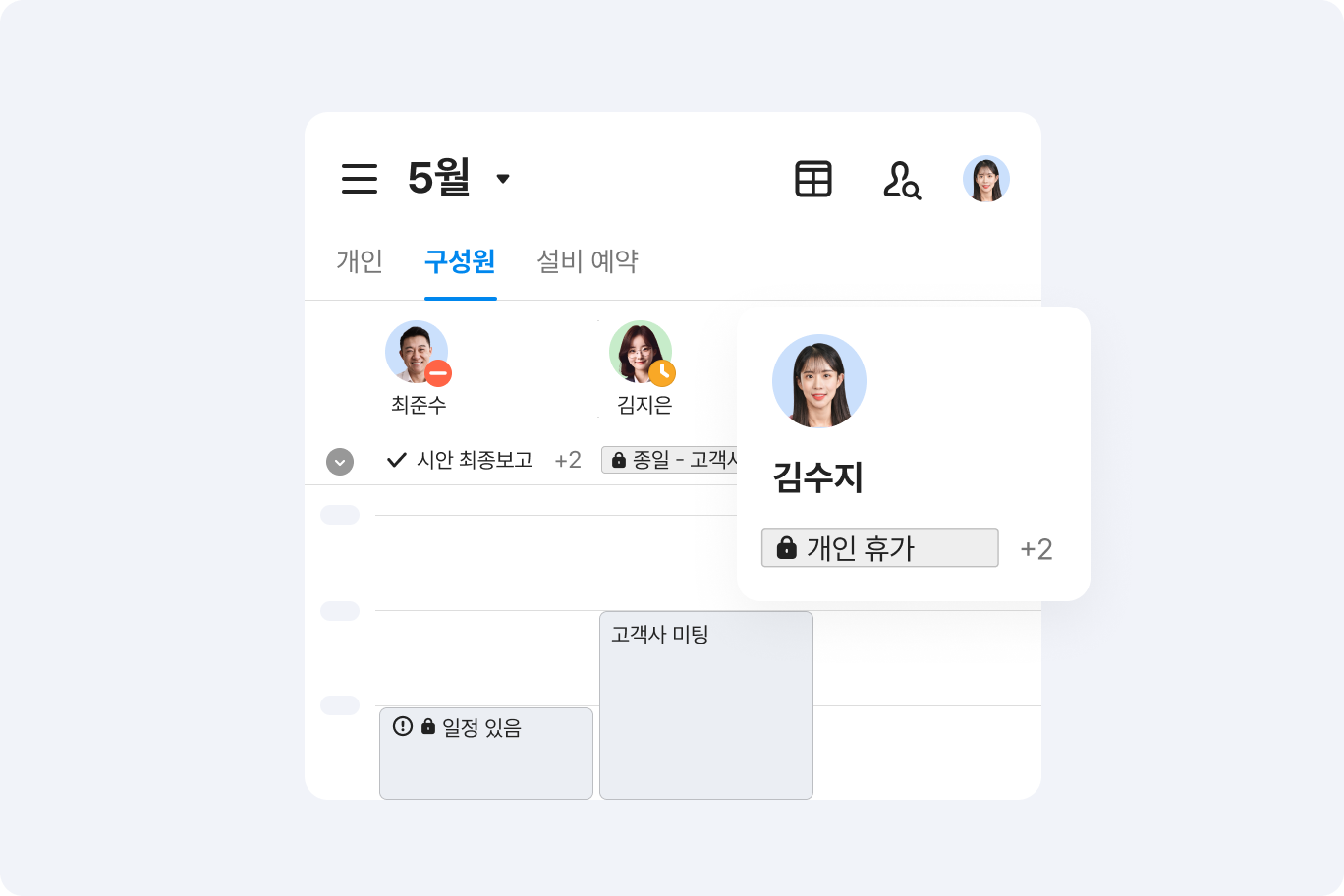 구성원 별 일정 및 업무 상태를 참고하여 한 층 효율적으로 협업할 수 있습니다.