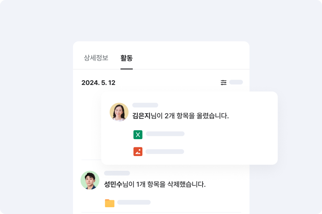파일 · 폴더 별로 사용자의 활동 이력을 기록하여 변경 사항을 한눈에 확인할 수 있습니다.