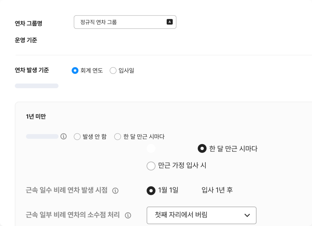 구성원 특성에 맞는 연차 기준을 설정하고 운영할 수 있어요.