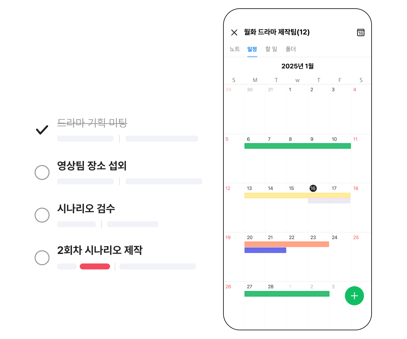 할 일 기능을 통해 각자의 역할과 기한을 명확하게 설정하고 분담합니다.