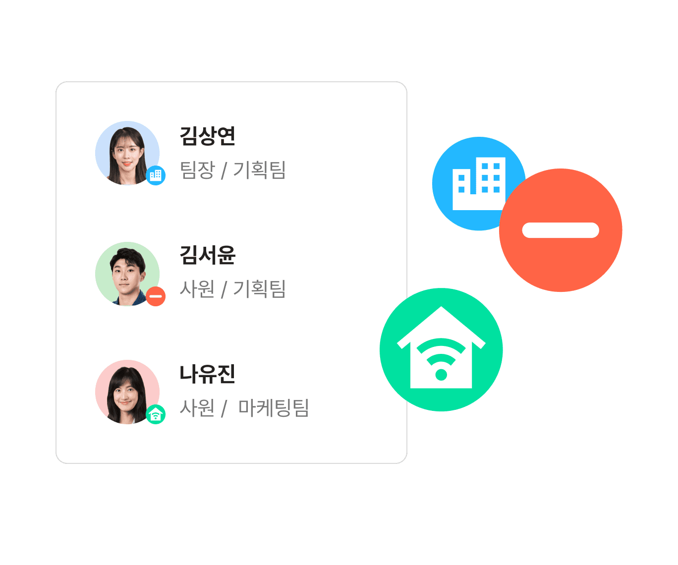 출퇴근 정보와 근무 유형이 조직도에 자동으로 업데이트됩니다.