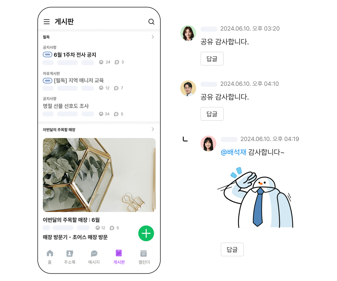 모든 지점이 게시판에서 동일한 업무 가이드라인을 확인합니다.